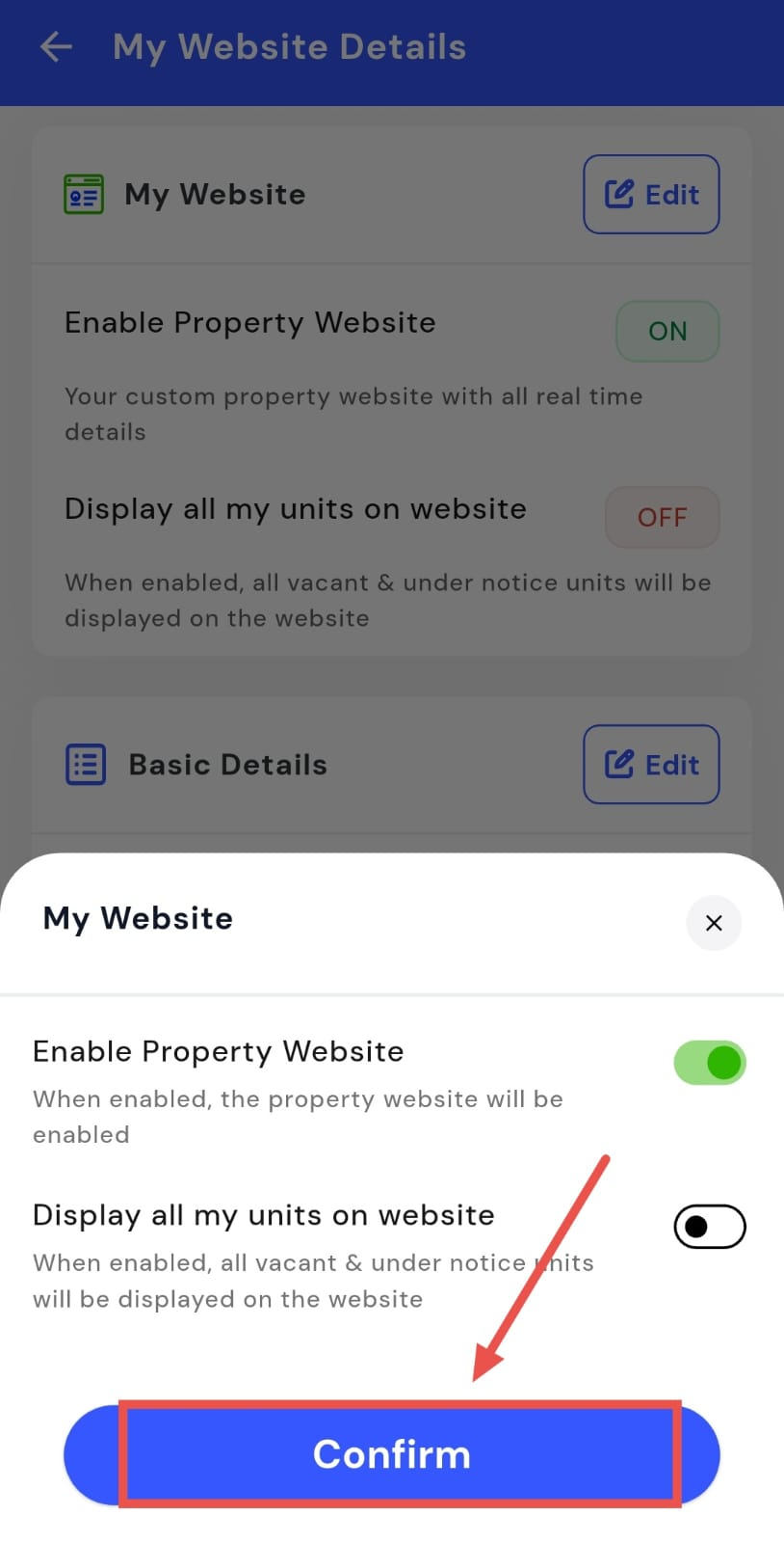 - Step 4: Confirm and save After making the required changes, tap on Confirm to apply the updated website details.