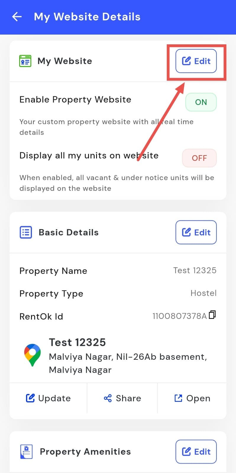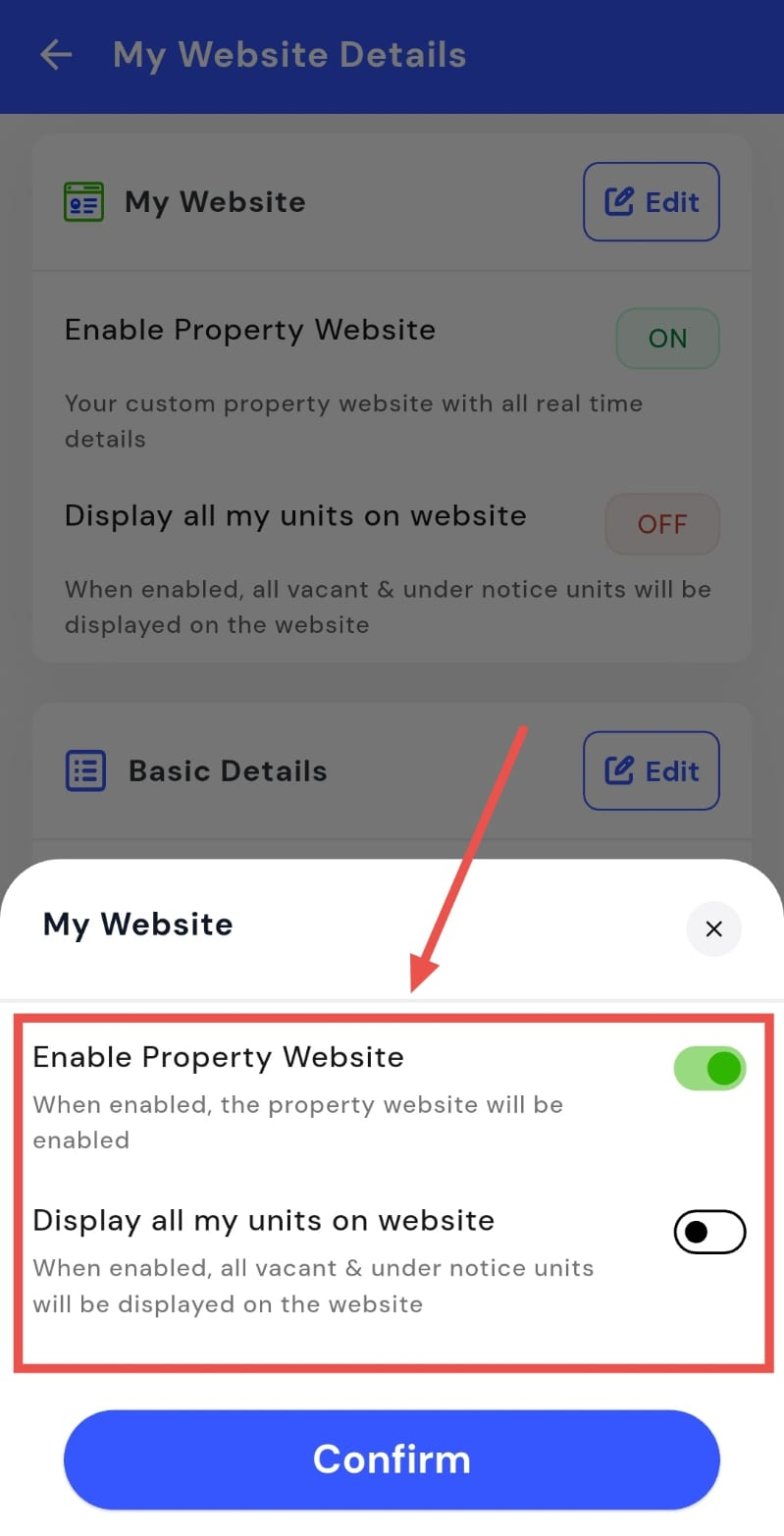 - Step 3: Enable the website On this screen, you will see the My Website option. Tap on Edit, then enable or disable your property website as required.